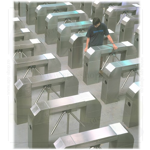 Turnichet tip "tripod",electromecanic, cu carcasa decor inox, pentru trafic foarte mare. Poate fi folosit in exterior dar sub un acoperis. In caz de urgenta, se roteste liber in sensul de iesire. Optional brat pliant antipanica.