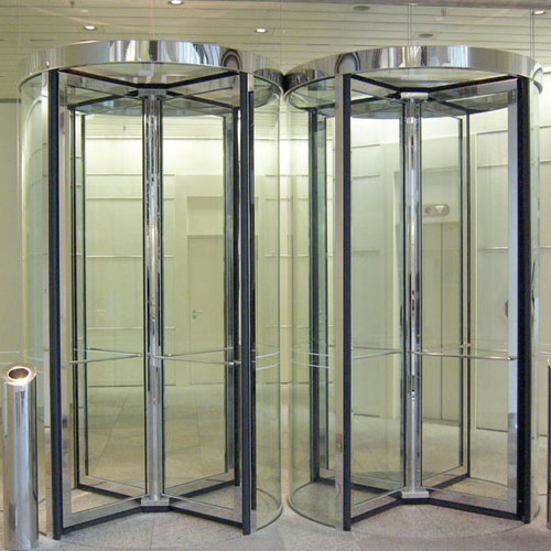 - Elementul rotativ contine 3 sau 4 canate, confectionate din sticla anti-vandal de 10 mm grosime, montate in profile T25, fara coloana centrala sau din panouri cu sticla WK2 sau P4A si profile T40;